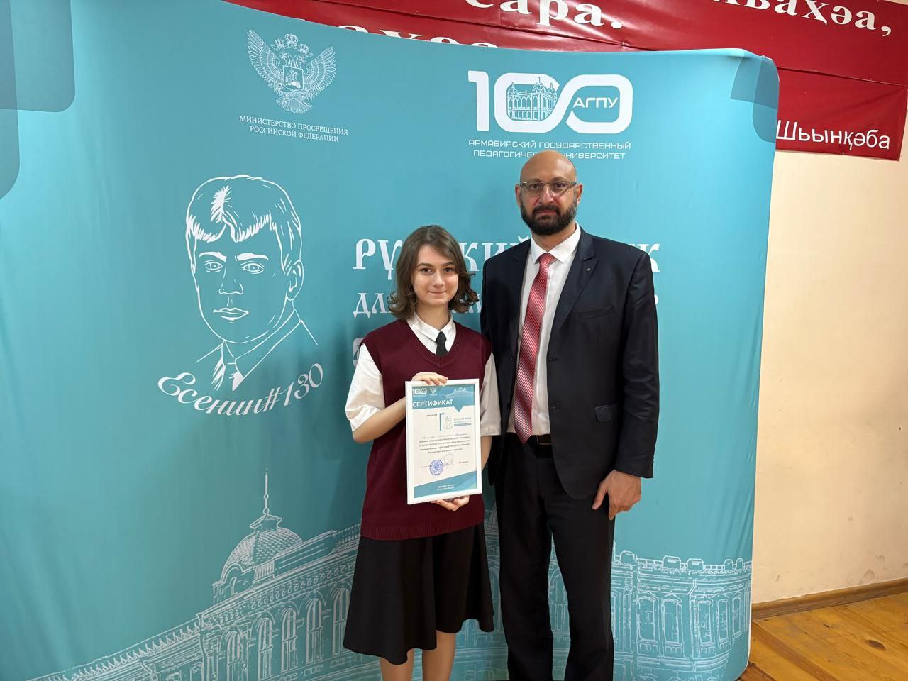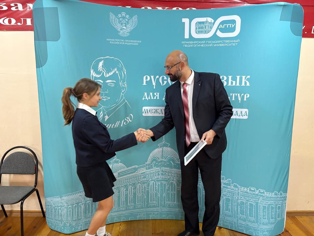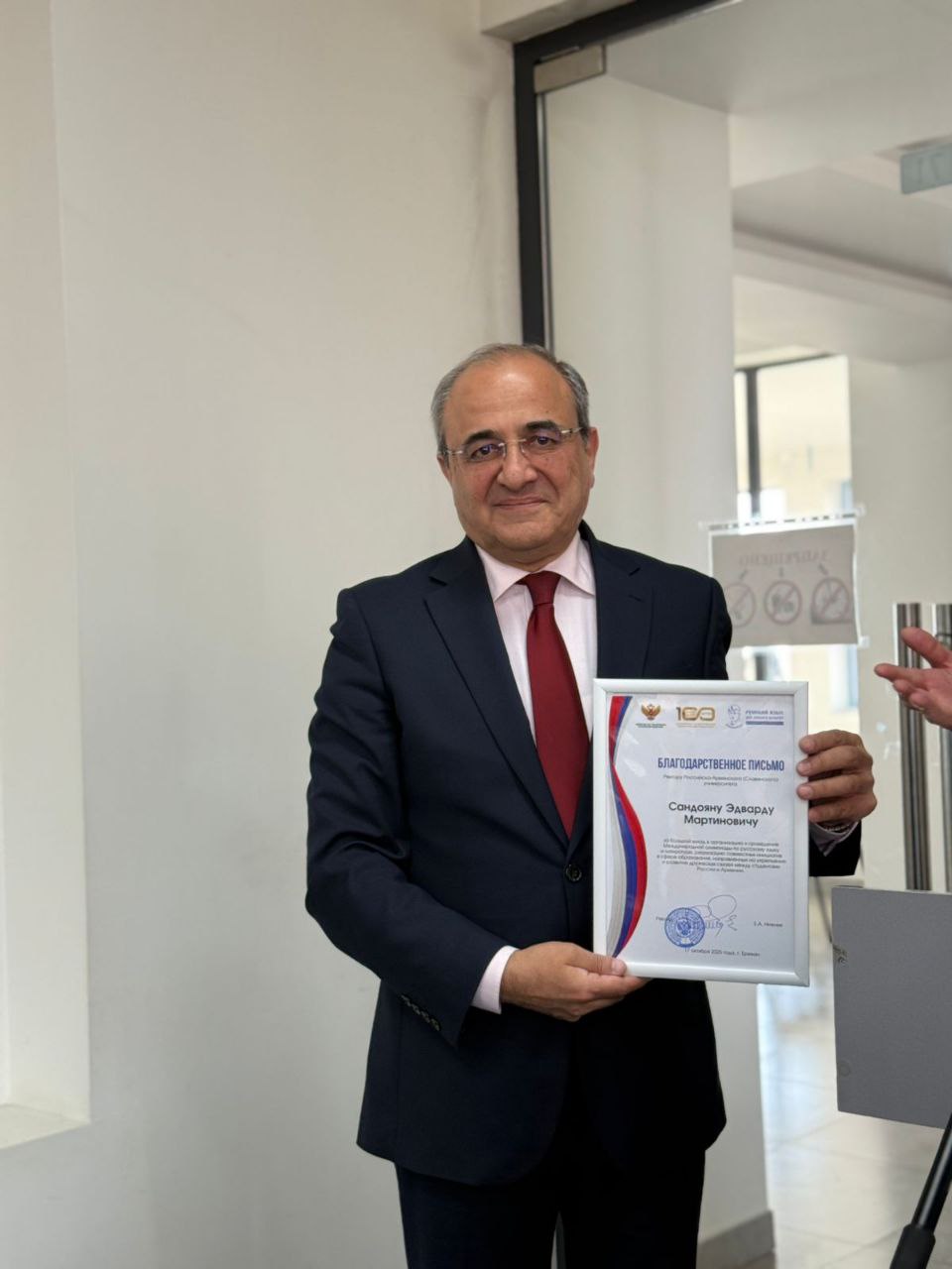 Ректор Армавирского государственного педагогического университета Евгений Нижник вручил благодарственное письмо ректору Российско-Армянского университета Эдварду Сандояну. Это - признание большого вклада в организацию и проведение Международной олимпиады, а также в реализацию совместных образовательных инициатив, направленных на укрепление и развитие дружественных связей между учащимися Армении и России.