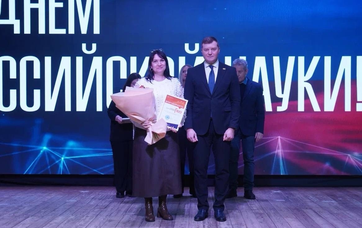 Благодарностью ректора АГПУ за активное участие в 2025 году в выполнении научных исследований в рамках международных проектов, а также в связи с Днём российской науки награждена: