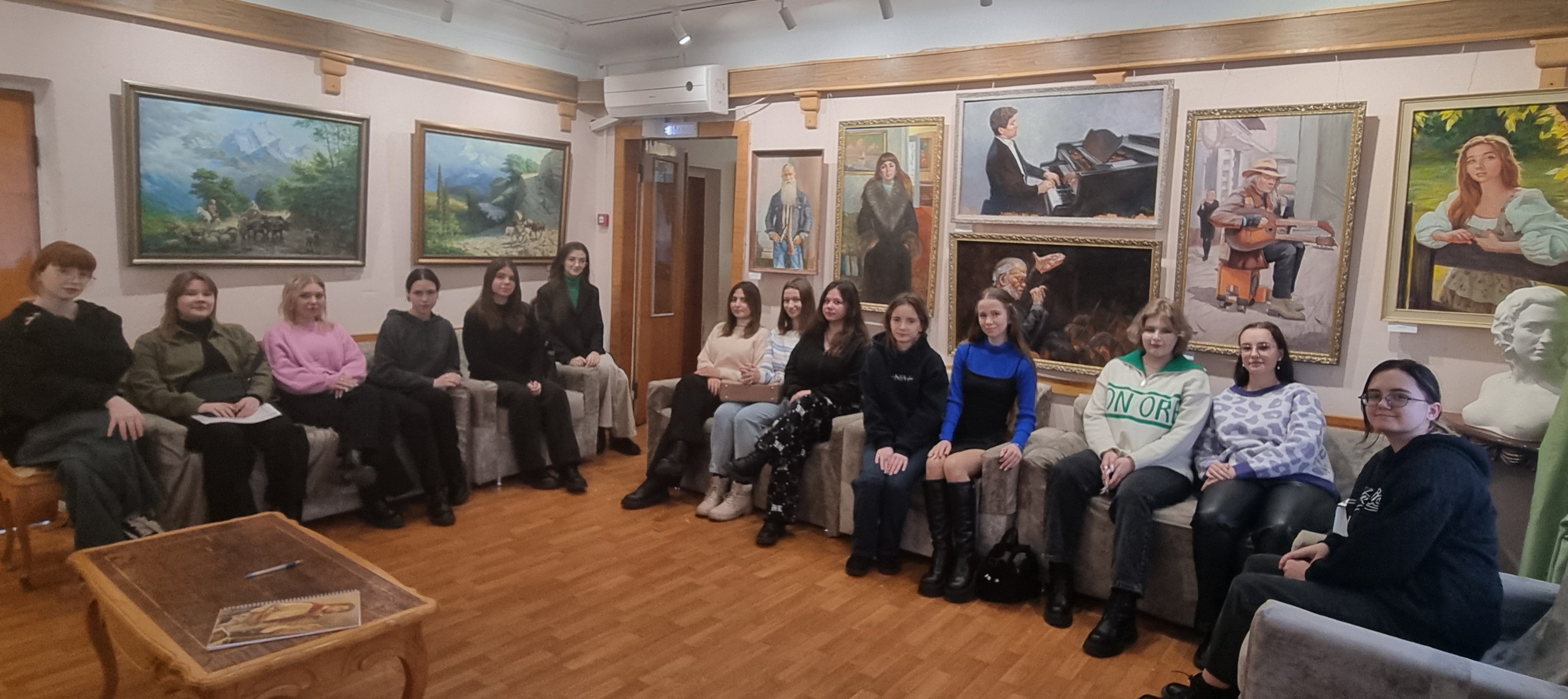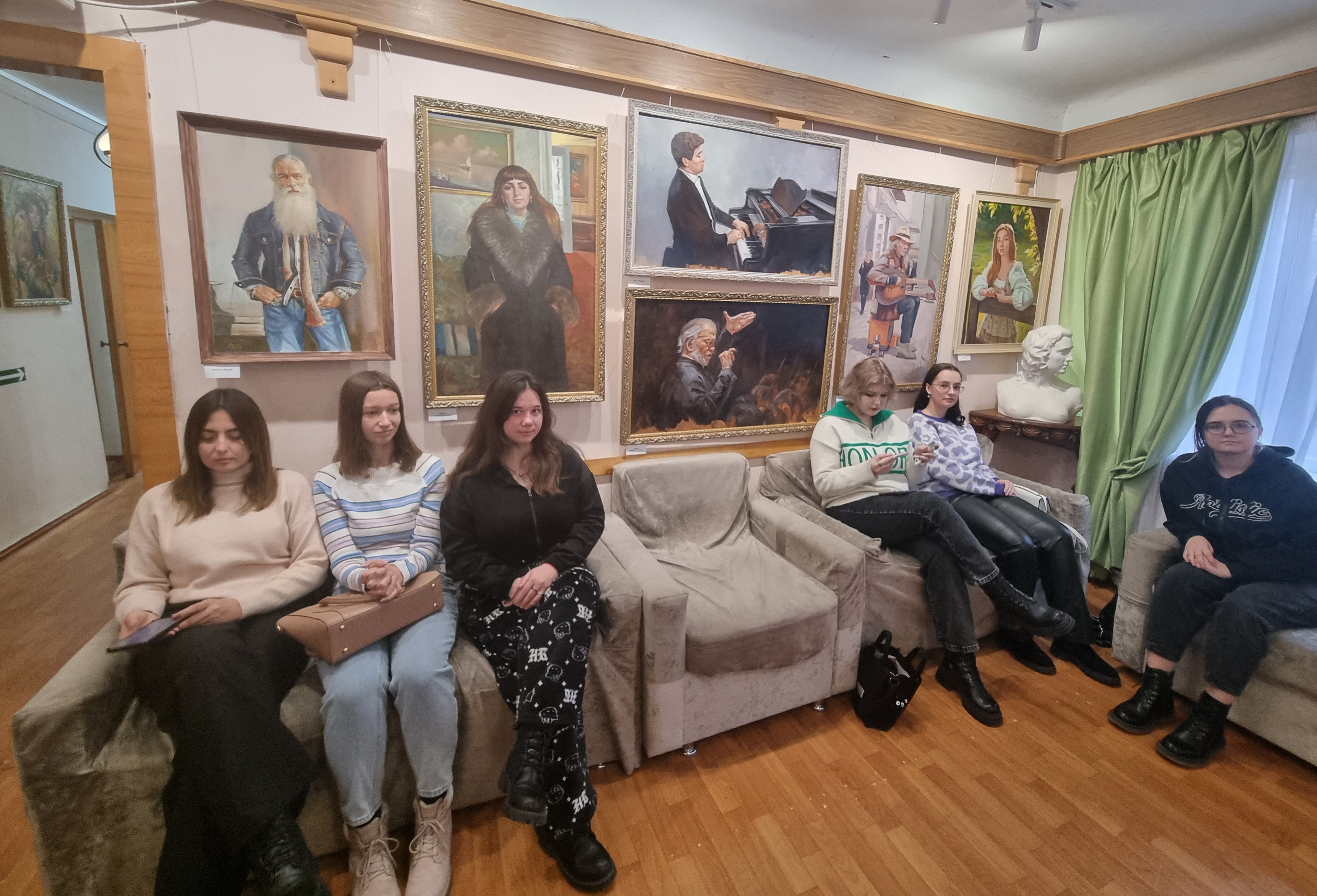 Совместно с заведующей отделом обслуживания библиотеки университета Маркосовой О. Н. заключительный день практики прошел в доме Саввы Дангулова. В его стенах обучающиеся ознакомились с работами краснодарского художника Гайка Сачиянца "Ностальгия" где были выставлены портреты всемирно известных музыкантов, а также родных и близких художника.
