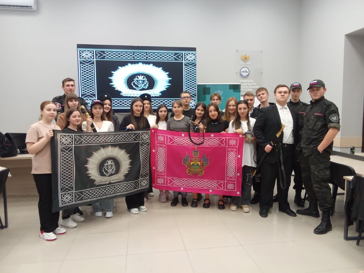 На встрече с Казачьей сотней АГПУ ребята услышали историю её создания. Но мало увидеть и услышать - нужно и попробовать. Все школьники получили возможность потренироваться в азах фланкировки нагайкой и шашкой под руководством наших казаков. И попробовали не только дети, но и сопровождающие, и наши педагоги!