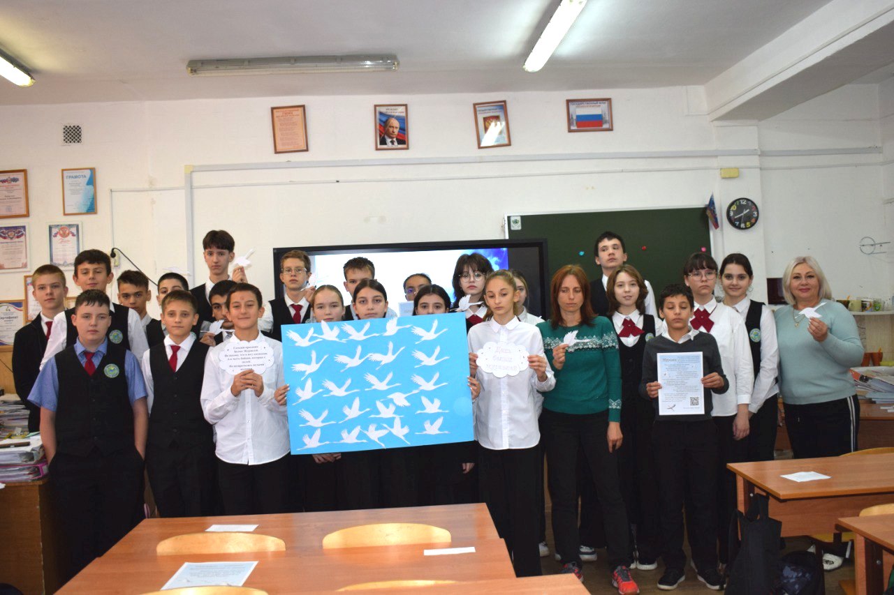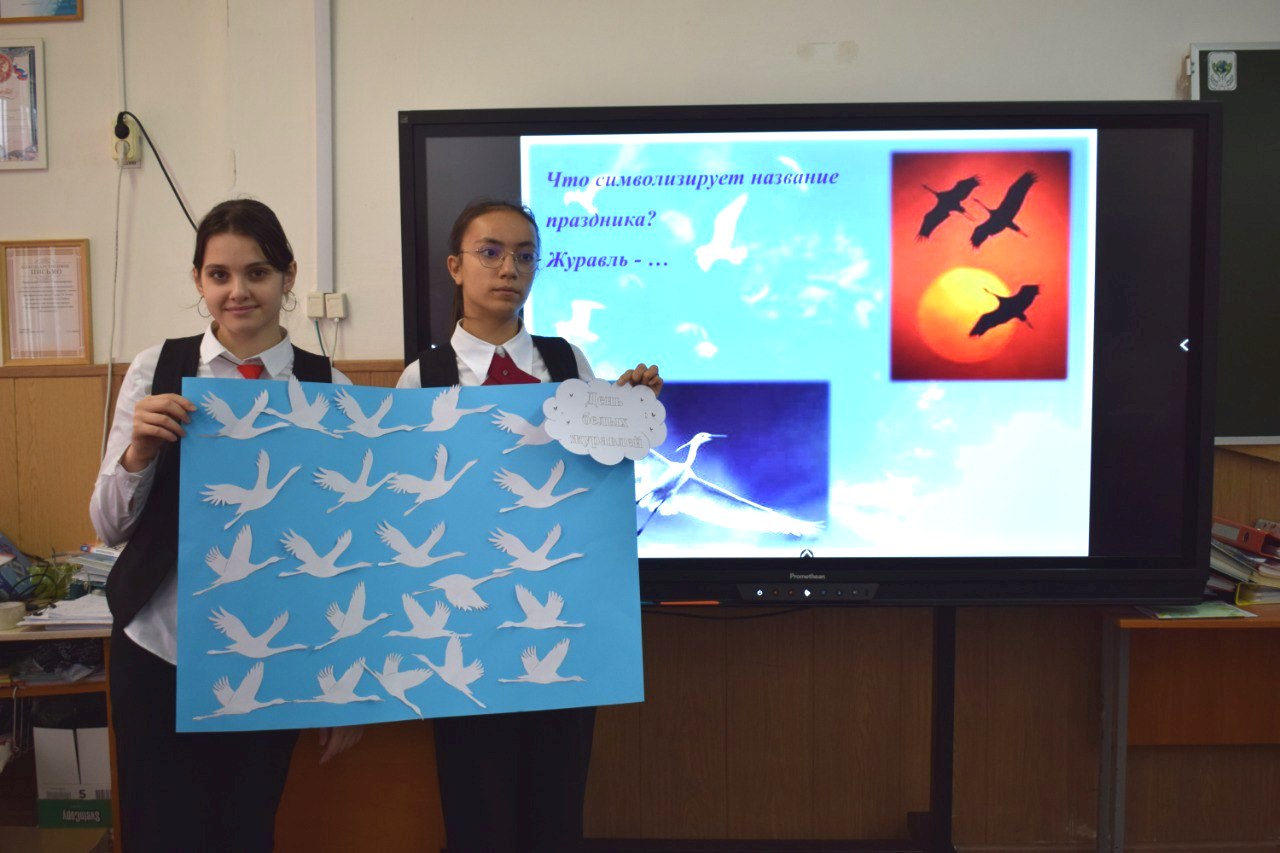 В этот день школьники не только вспомнили тех, кто положил свои жизни на алтарь победы на всех полях сражений, но и окунулись в мир истории и традиции праздника, узнали, почему именно журавль стал символом этого дня. Кульминацией мероприятия стала песня «Журавли» Марка Бернеса на стихи Расула Гамзатова, которая звучала как гимн, песня-молитва, плач по всем солдатам, «с кровавых не вернувшихся полей».