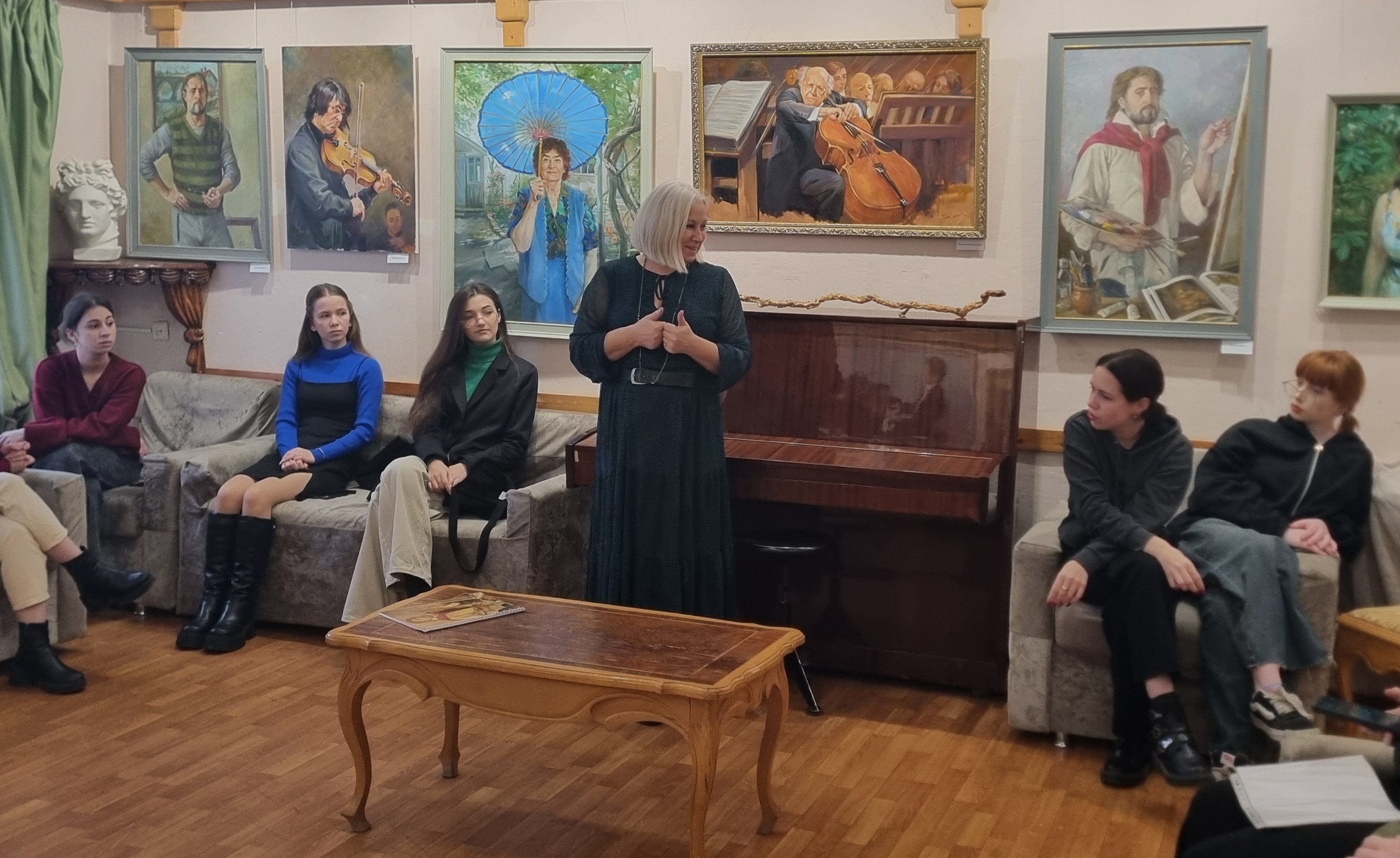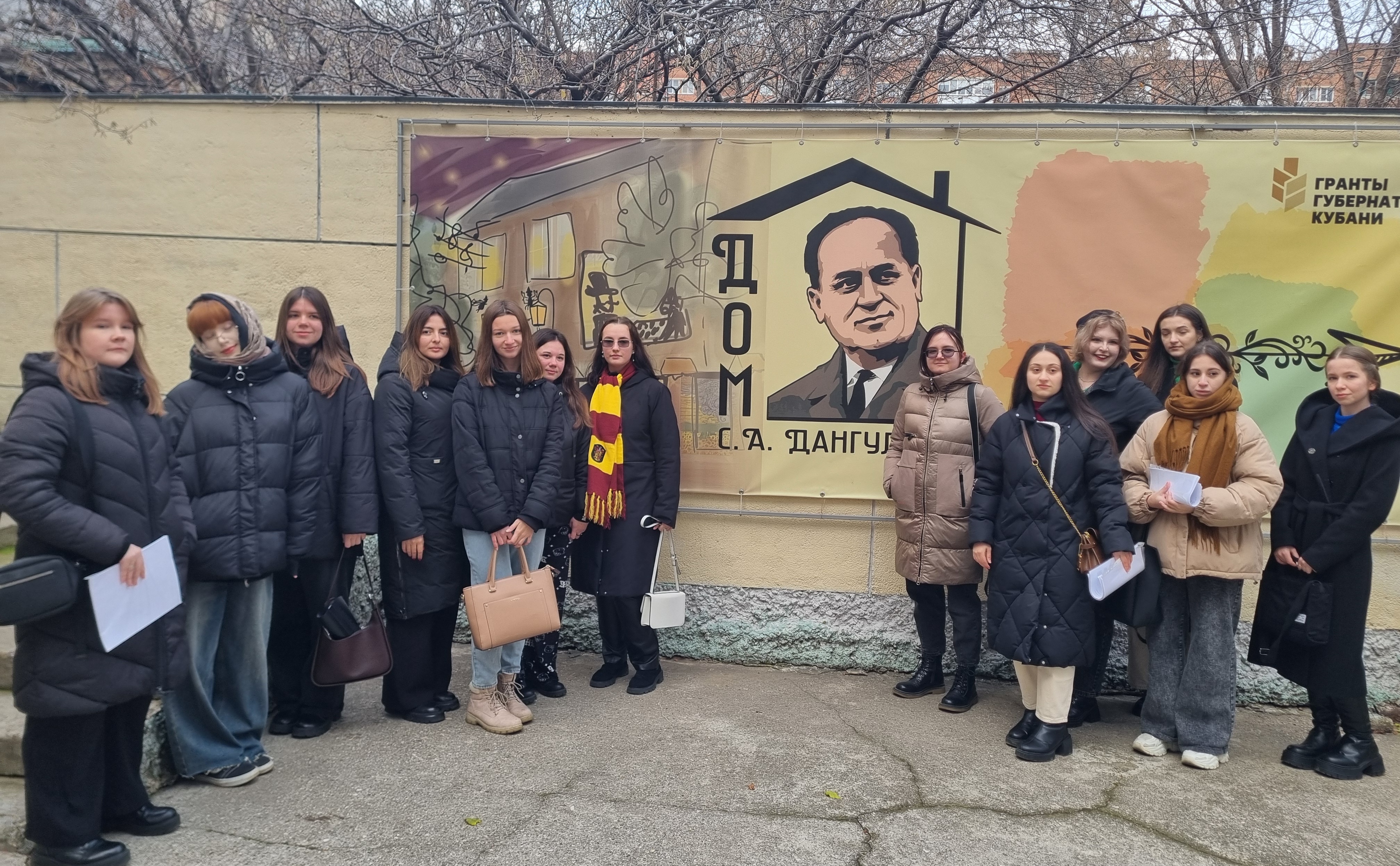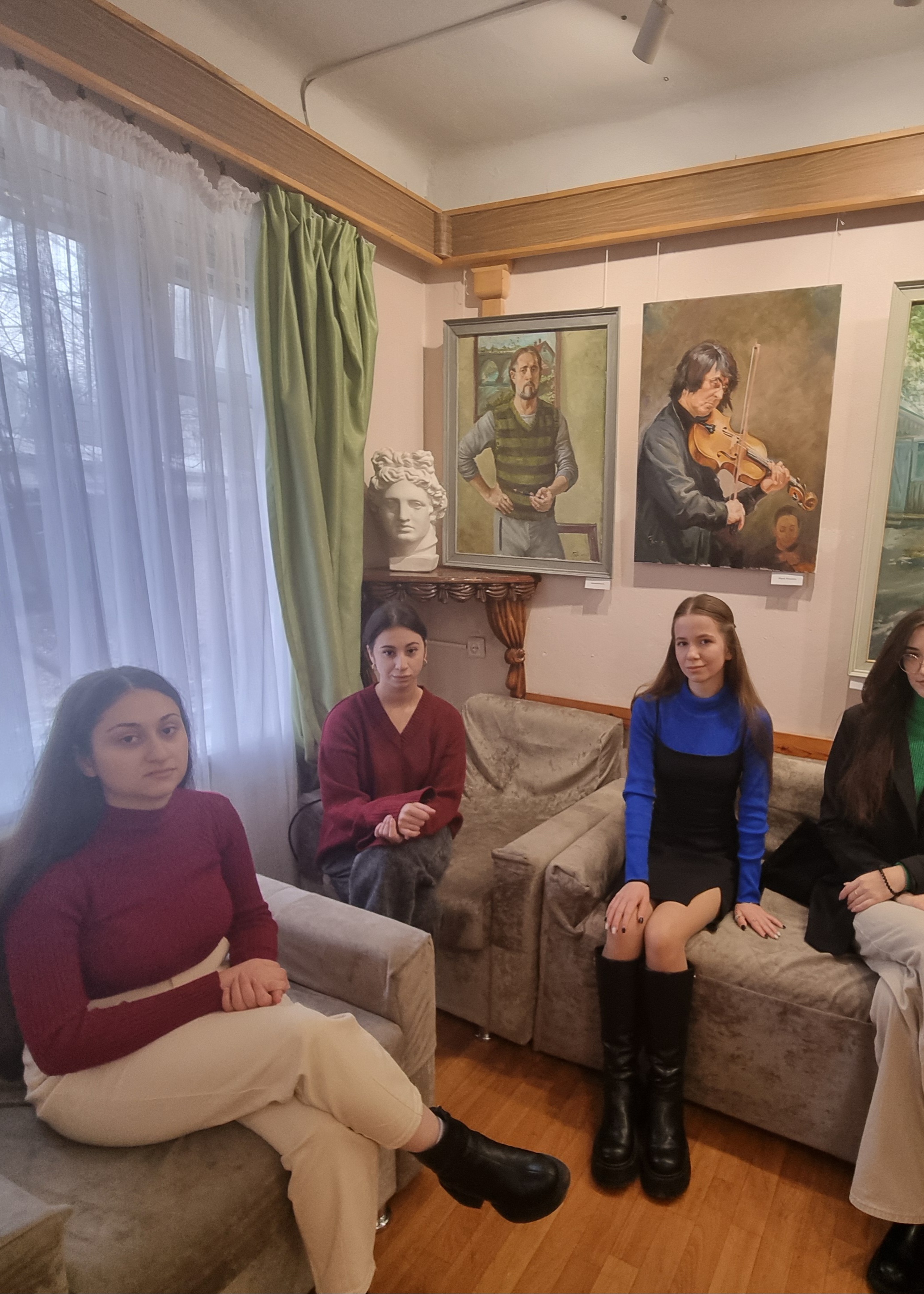 Совместно с заведующей отделом обслуживания библиотеки университета Маркосовой О. Н. заключительный день практики прошел в доме Саввы Дангулова. В его стенах обучающиеся ознакомились с работами краснодарского художника Гайка Сачиянца "Ностальгия" где были выставлены портреты всемирно известных музыкантов, а также родных и близких художника.