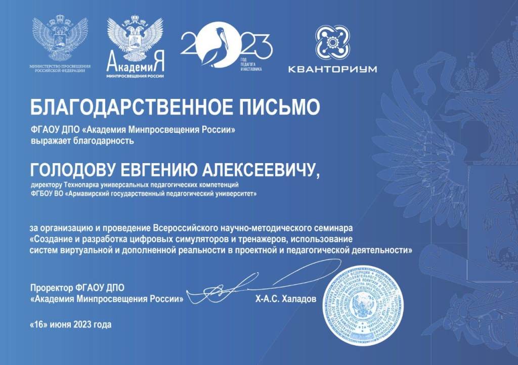 В рамках работы по распространению опыта работы Технопарков и тиражированию успешных практик Академия Мипросвещения России проводит ряд тематических научно-практических семинаров. Участником семинара «Создание и разработка цифровых симуляторов и тренажёров, использование систем виртуальной и дополненной реальности в проектной и педагогической деятельности» стал директор Технопарка АГПУ Евгений Голодов.